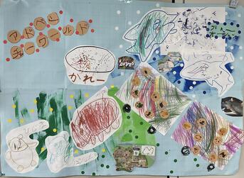 下見の写真や施設の動画を見て調べて、大きな模造紙にコラージュしました。