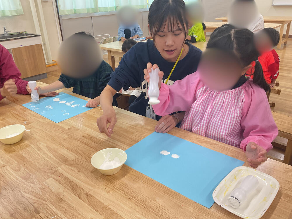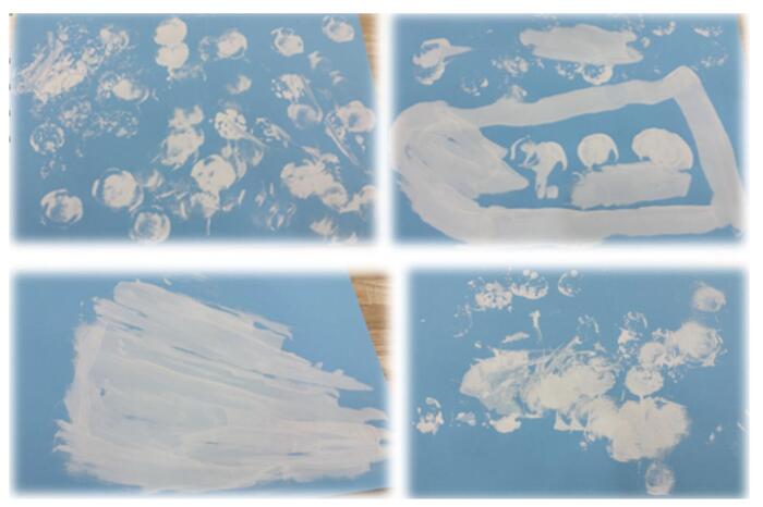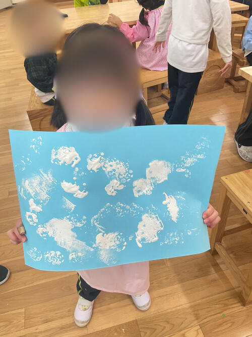 先端がスポンジやプチプチになっているスタンプを用いて水色の画用紙に色を付け、自分なりの雲を描くことができました。