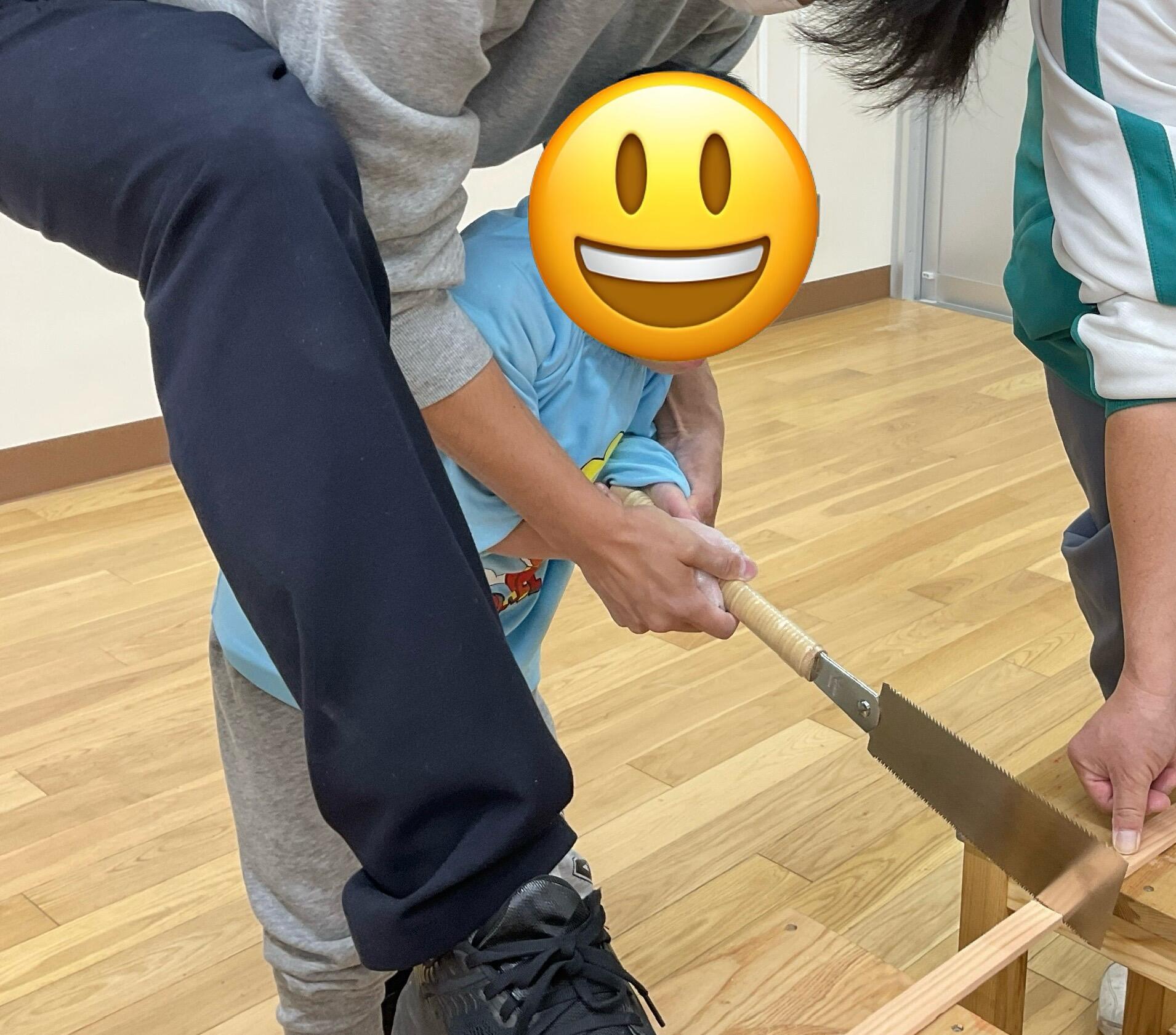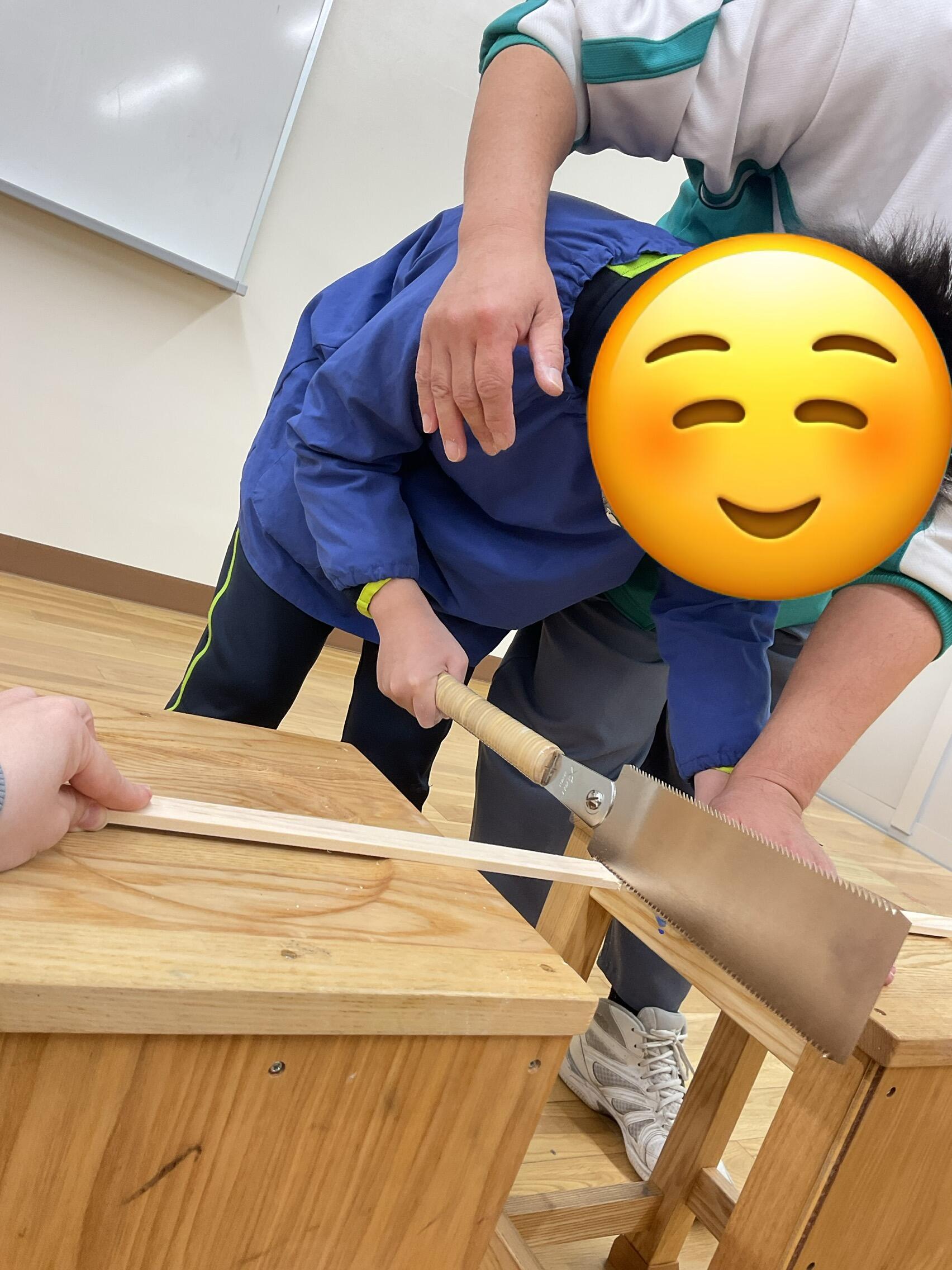 木工室にある中学部、高等部の先輩たちが使用しているのこぎりを借りて、ギコギコギコ...