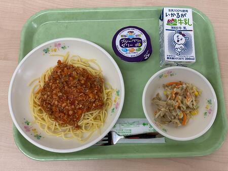 10月10日.jpg | 金 | ミートスパゲッティ、ごぼうレモンサラダ、ブルーベリーゼリー、ぎゅうにゅう |