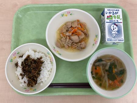 10月15日.jpg | 水 | ごはん、とりにくのしょうがいため、てづくりこまつなふりかけ、さわにわん、ぎゅうにゅう |