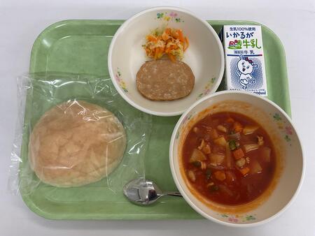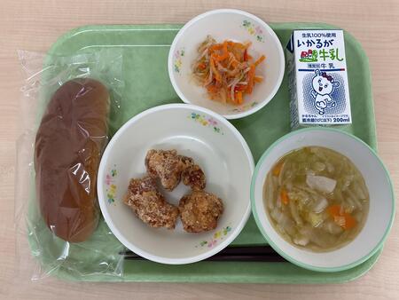 10月7日.jpg | 火 | こくとうパン、とりのからあげ、かんてんサラダ、はくさいとだいこんのスープ、ぎゅうにゅう |