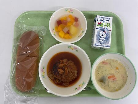 | 11月6日.jpg | 木 | こくとうパン、てづくりハンバーグ、ポタージュスープ、フルーツ&カクテルゼリーあえ、ぎゅうにゅう |