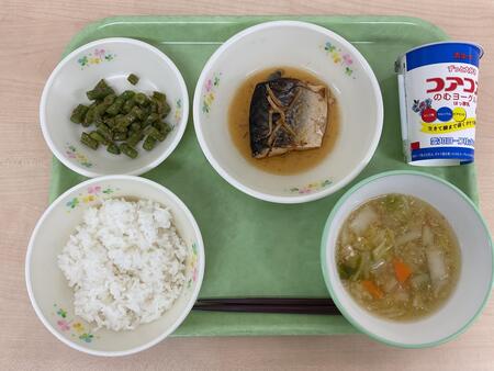 | 11月12日.jpg | 水 | ごはん、さばのしょうがに、さんどまめのかつおうめふうみ、はくさいそぼろじる、コアコアのむヨーグルト |