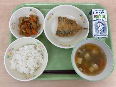 | 11月7日.jpg | 金 | ごはん、あじのフライ、れんこんとだいずのきんぴら、けんちんじる、ぎゅうにゅう *いい歯の日メニューです。 |