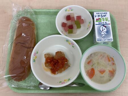 | 12月11日.jpg | 木 | おさつパン、チキンソテー・トマトソースかけ、クリームスープ、カクテルゼリー |
