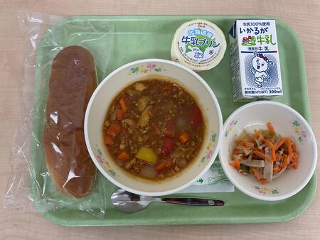 コッぺパン、トマトカレー、ちゅうかサラダ、ぎゅうにゅうプリン、ぎゅうにゅう *高2 炎の4人組考案メニューです。 |