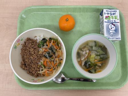 | 12月9日.jpg | 火 | ビビンバ、わかめとにらのちゅうかスープ、みかん、ぎゅうにゅう |
