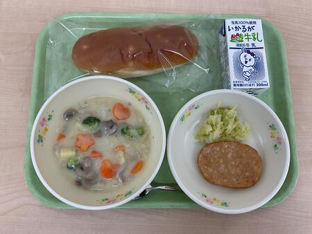 アップルパン、ハムステーキ、キャベツソテー、やさいのクリームに(中2C班考案)、ぎゅうにゅう |