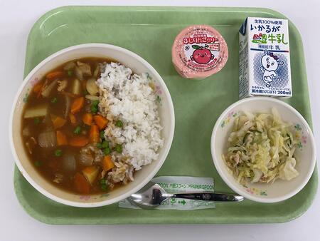 | 4月13日.jpg | 月 | チキンカレーライス、グリーンサラダ、りんごゼリー、ぎゅうにゅう |