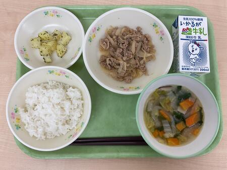 | 4月21日 | 火 | ごはん、ぶたにくのしょうがやき、さつまいものあまみつかけ、ビーフンスープ、ジョア |