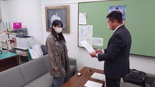 大西さんからは、今後の進学予定先や将来に就きたい職業についての話を聞かせてもらい、同席していた准校長・教頭・担任から、大西さんに向けた応援メッセージが贈られました。