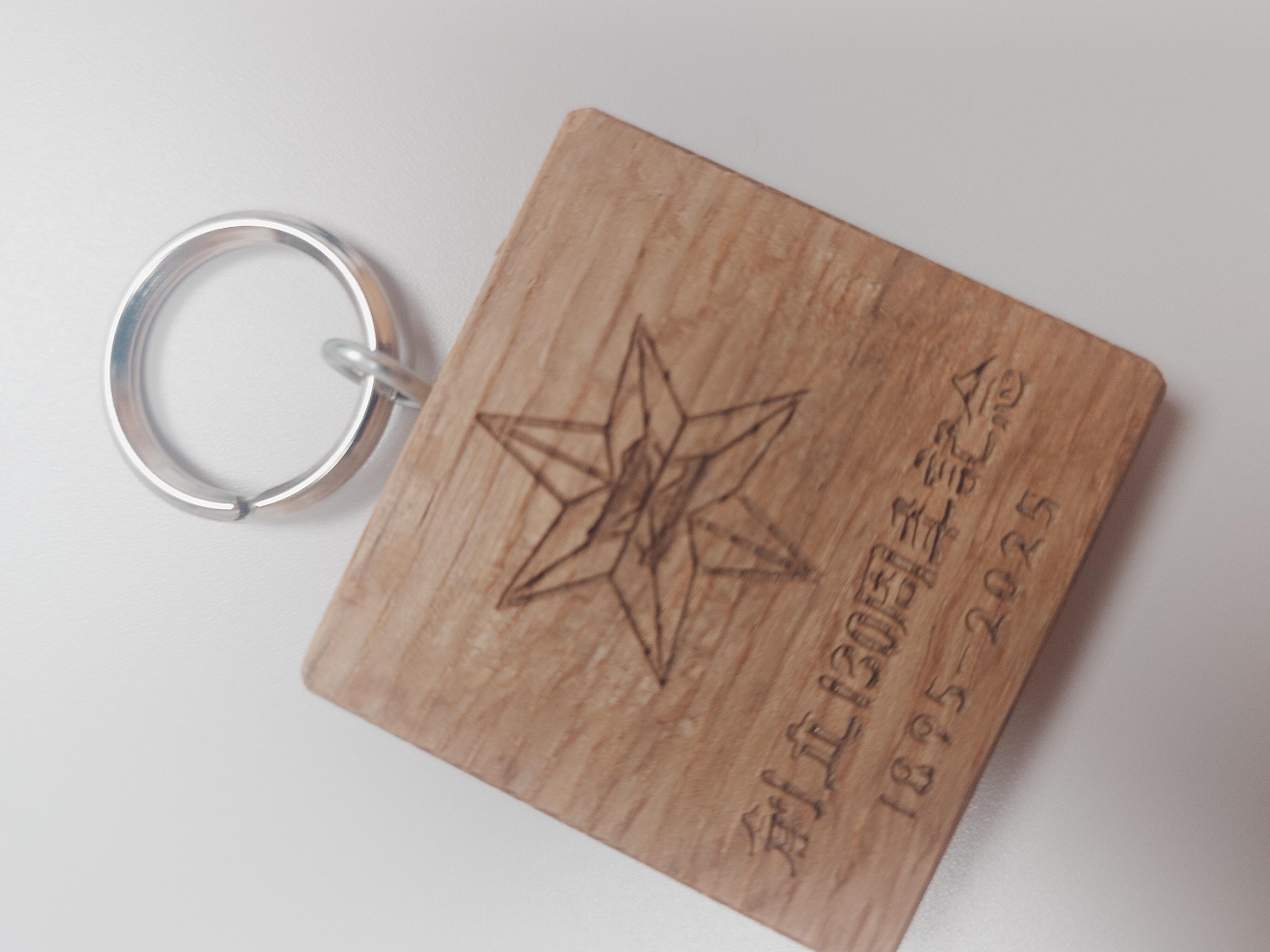 さて、その床板を廃材として処分するのではなく、何か形として残そうとした結果、木製キーホルダーにしたそうです。ちょうど、職員会議の前に配布されました。刻印された文字は、全日制の書道部の生徒さんがかいたものだそうです。