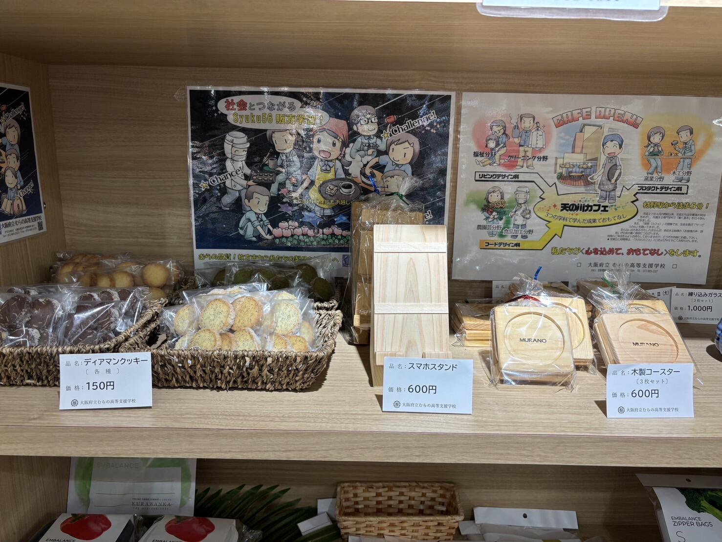 枚方モール1階にあるオシャレで立派なSyuku56の店頭に自分たちの製品が並べられ、販売されていることを知り、作業に取り組むモチベーションがとても上がりましたという生徒もたくさんいます。また、毎週金曜日にはクリーニング分野の3年生が校外集配のために枚方信用金庫様を訪問させていただいていますが、その後、Syuku56に向かい、食品加工分野のディアマンクッキーを納品したり、天の川カフェ営業カレンダーのチラシを届けたりする業務(学習)も定着してきました。