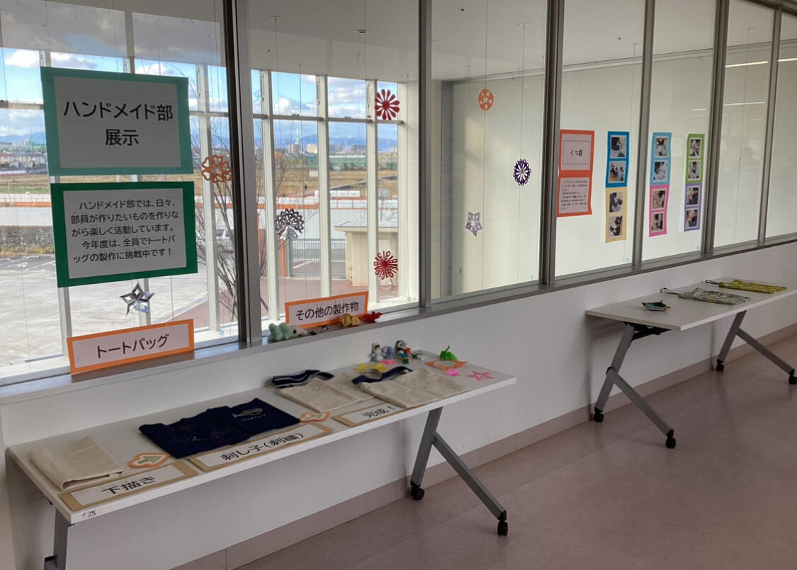 今年度は、2年家庭科、2・3年美術科、ハンドメイド部、美術部が作品展示を行いました。