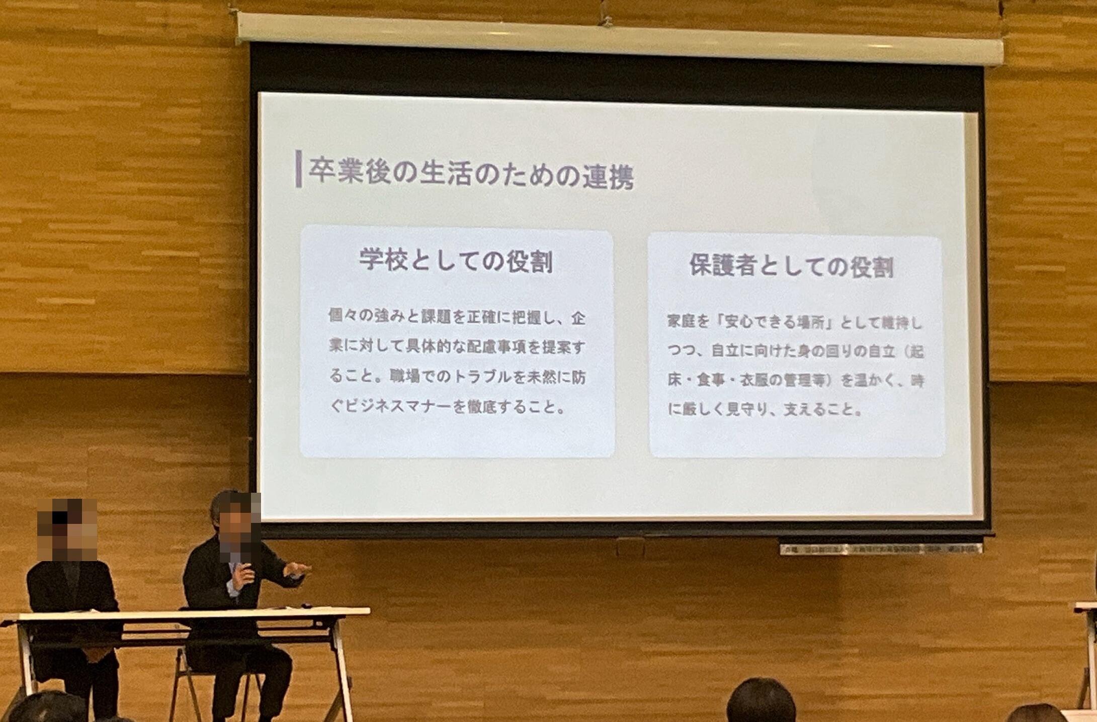 高等支援学校卒業生の社員の皆様には、質疑応答についても回答をいただき、講演を通じて参加した保護者にとっては就労による社会的自立のイメージを知る貴重な機会となりました。閉会での「就職はゴールではなく、社会の一員として自分らしく生きていくためのスタートであることが知れて勉強になりました」というPTA会長の挨拶が印象に残った有意義な研修会でした。