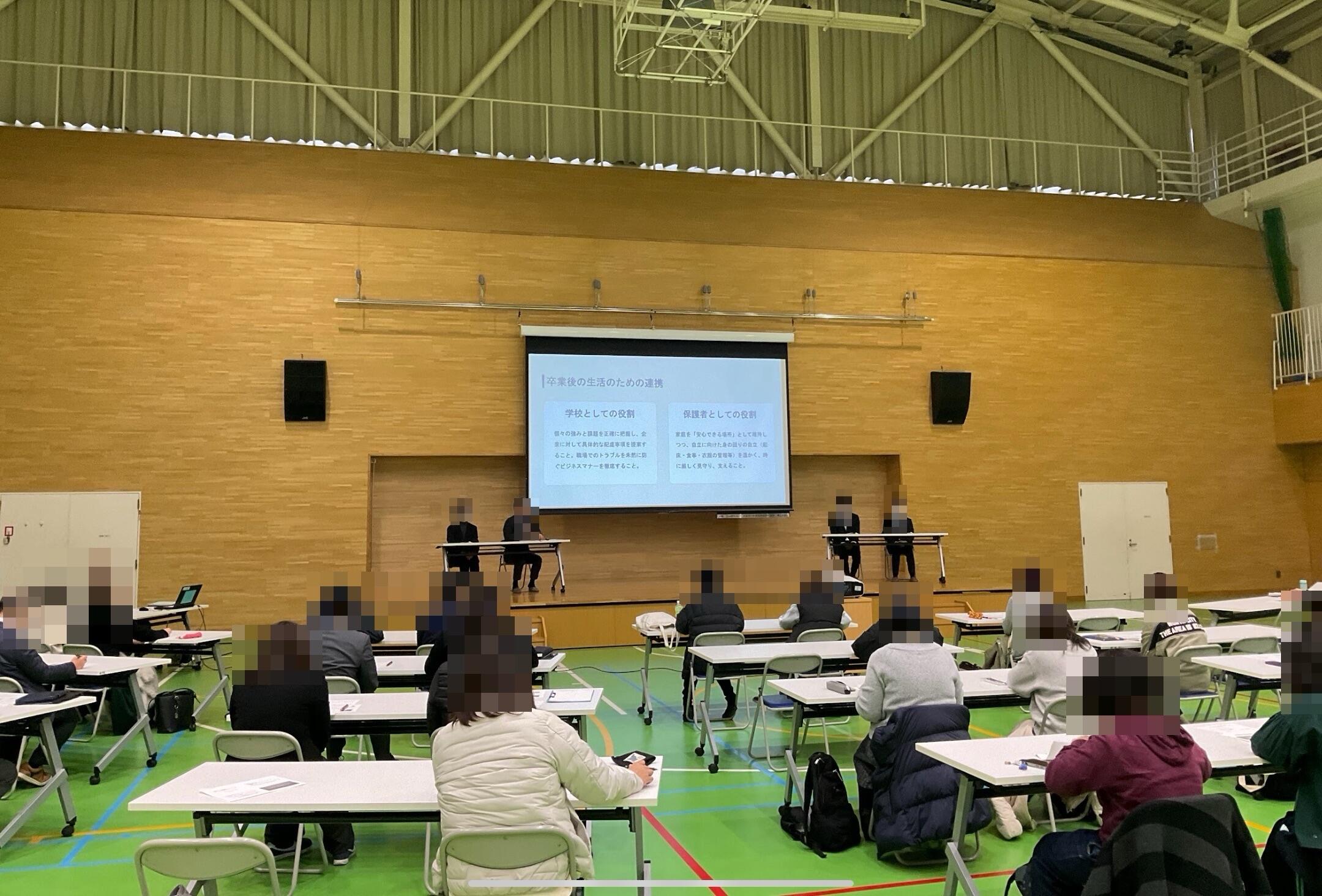 12月25日(木)午前中に本校体育館にて、PTA進路研修会〈障がい者雇用の実際〉を実施しました。この研修会は、令和7年度 大阪府立むらの高等支援学校 就労支援アドバイザー派遣事業を活用したもので、本校の担当企業であるグローバルコミュニティ株式会社様にご協力いただきながら、むらのPTA役員会と連携し開催しました。