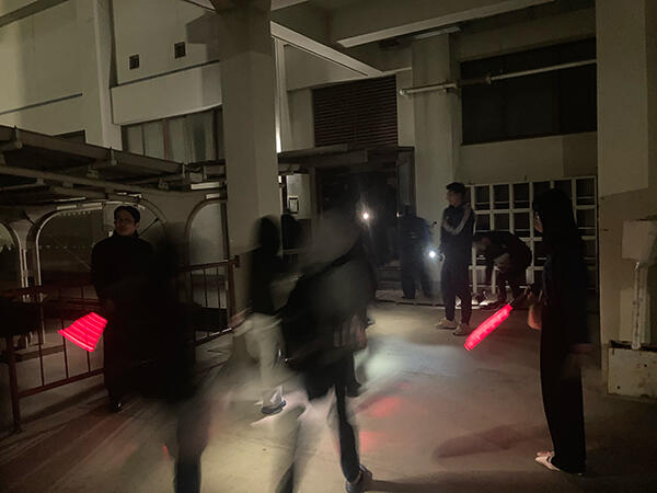 夜桜での授業中に災害が発生し停電した場合、文字通り真っ暗になってしまいますので、万が一を想定して真っ暗の避難訓練をしています。