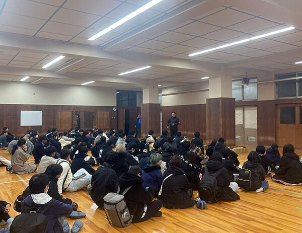 避難完了後は准校長から宿泊施設等では必ず掲示されている「避難経路図」のお話と、少し話は脱線しますが、これから寒くなってきますので、「ヒートショック」についてお話しました。