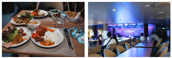 夕食は船のレストランでバイキング、メニューは韓国料理が中心。