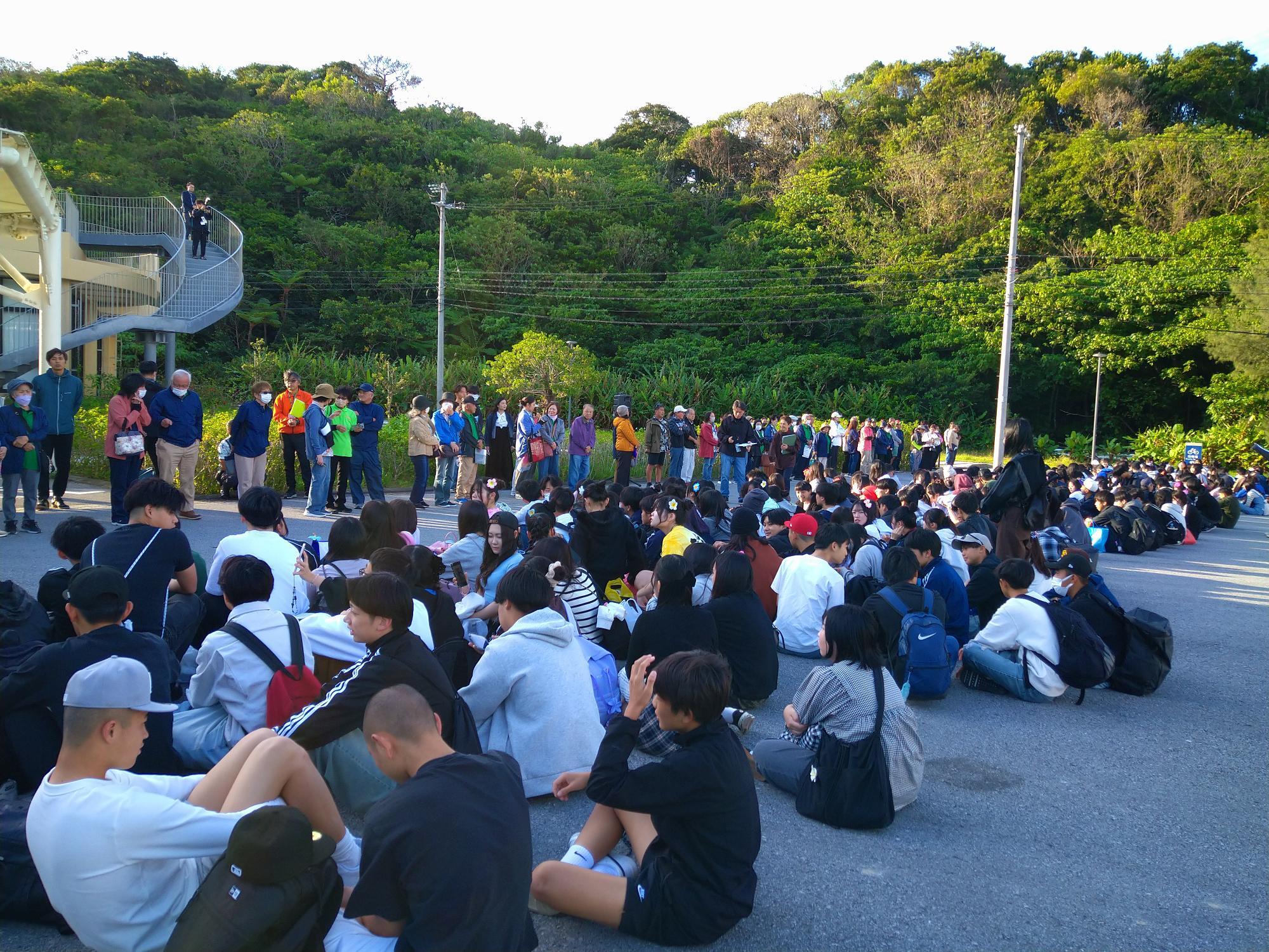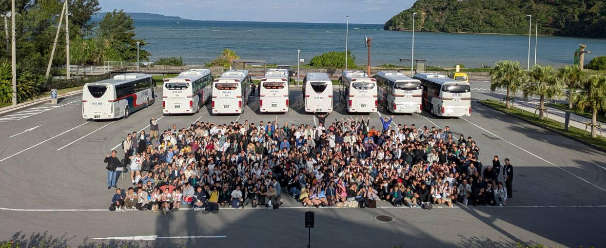 37期生、3泊4日の修学旅行が始まりました。沖縄での生活体験(民泊)や、体験活動(スポーツ、文化、観光)を通して、楽しい思い出を作ります。6時50分に集合、8時35分に大阪空港を出発し、11時に那覇空港に無事到着しました。生徒たちは楽しく語り合い、みんな元気に過ごしています。到着後、首里天楼にて、沖縄そば、ゴーヤチャンプルなどの昼食をいただきました。バスで本部港に移動し、そこからフェリーで伊江島へ。入村式を行い、民泊の方と対面し、各家庭へと移動しました。伊江島での2日間の生活体験が始まります。