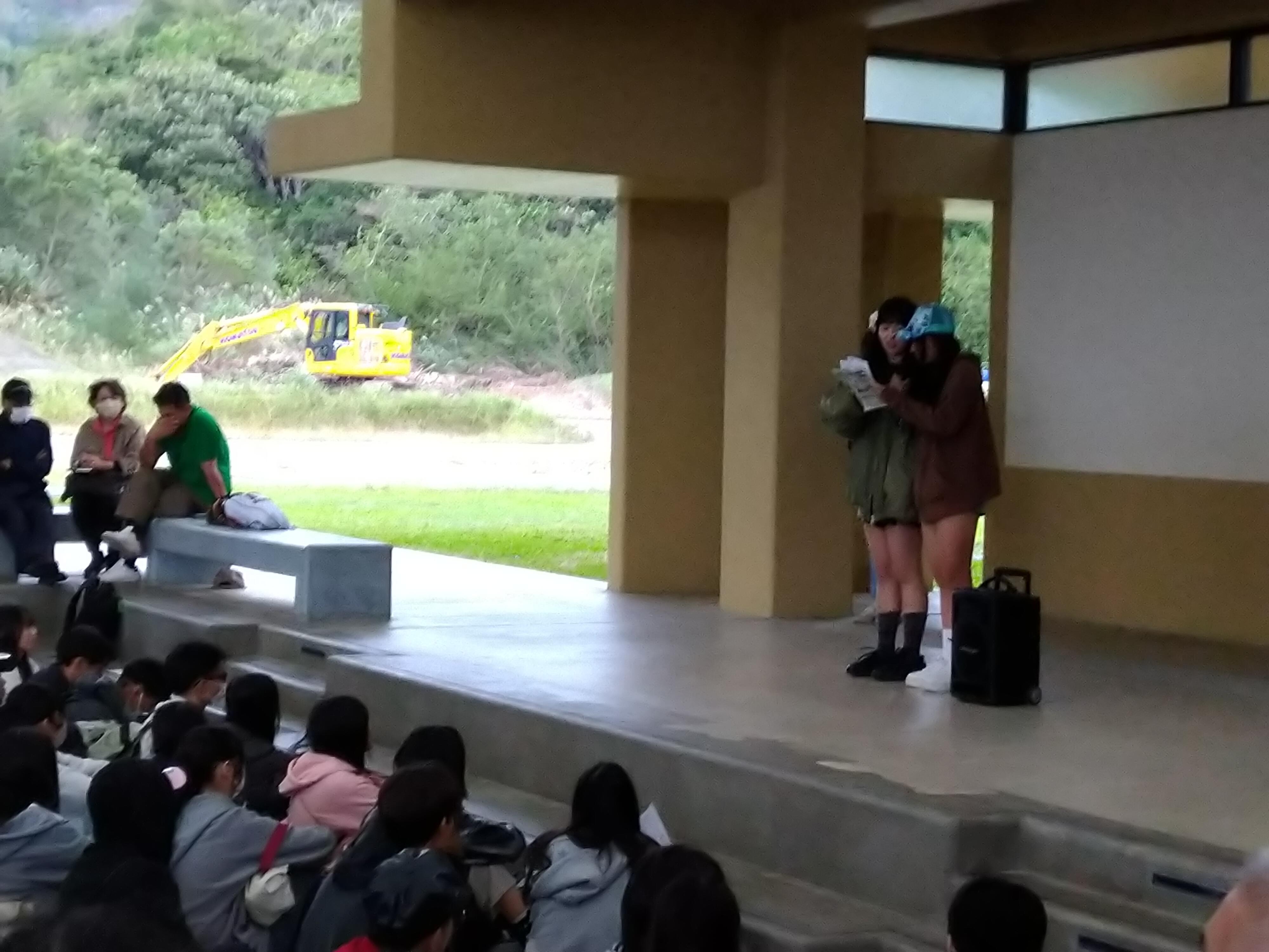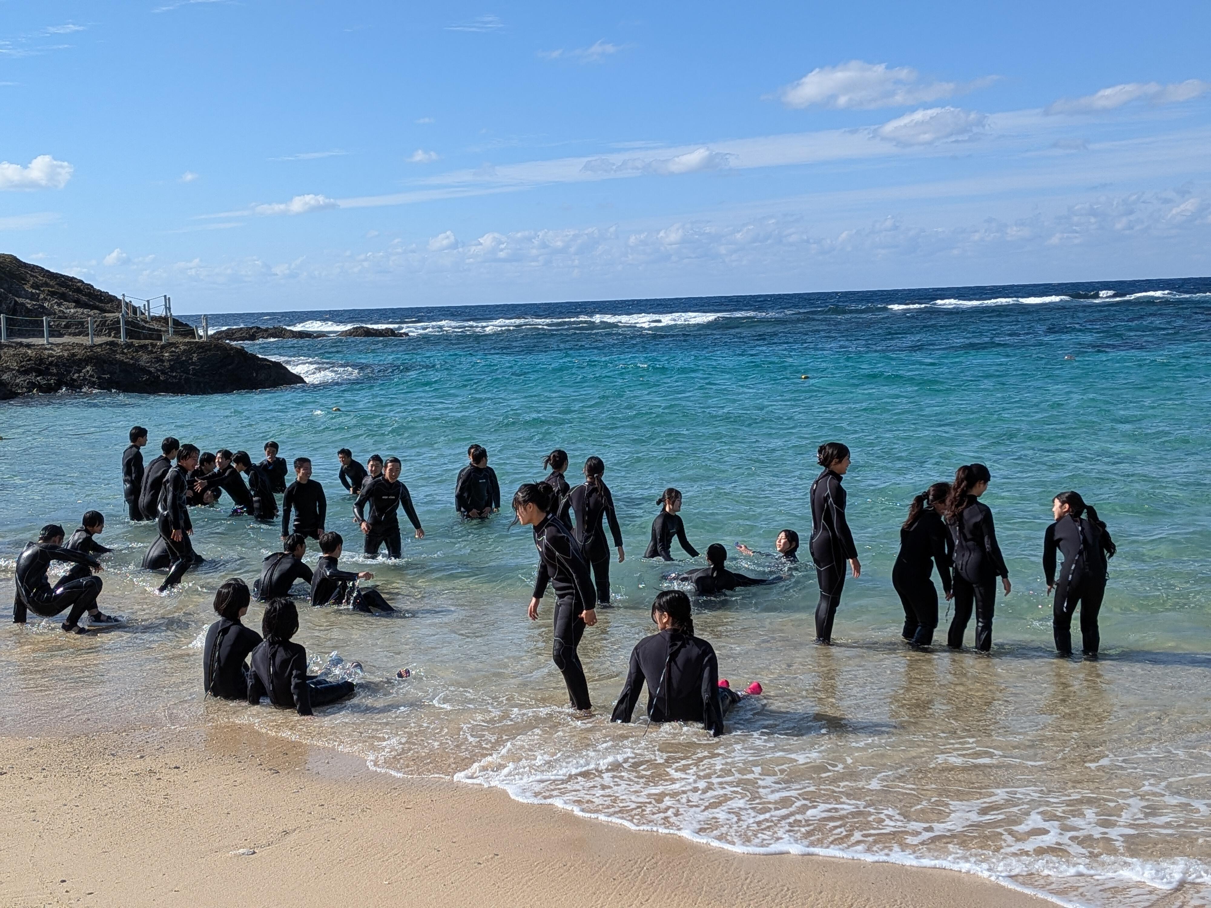 退村式。おとう、おかさ、たんめー、んーめーへ、(2泊)お世話になった思いをそれぞれに伝え、自然と涙が光るグループもありました。退村式後は、体験プログラム(カヌー・釣り・ガラス細工、シーサー作り等)へそれぞれ出発。北風が強く、波も高く、短時間バージョンでのマリン体験。澄んだ海を楽しみつくしていました。