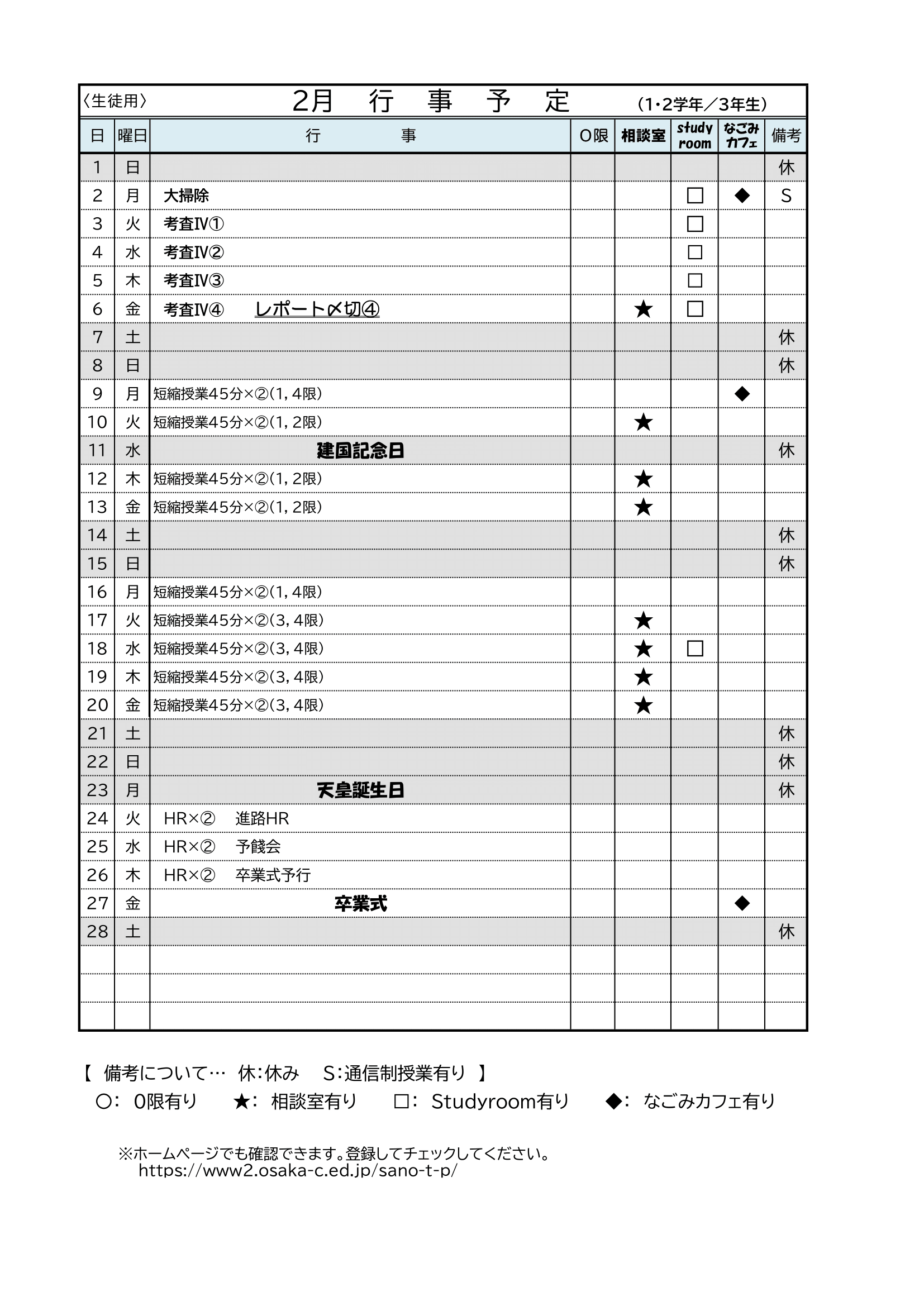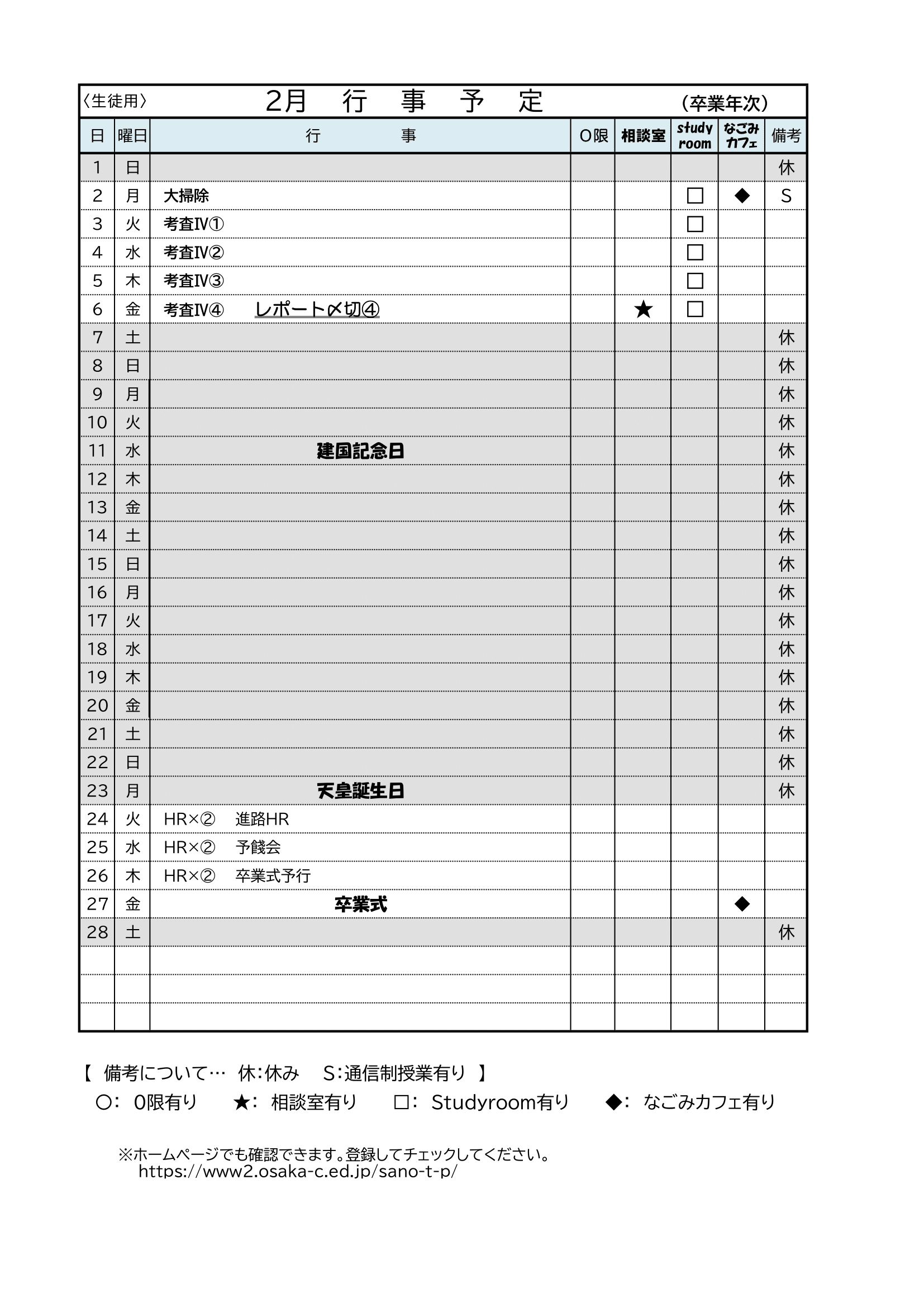 令和7年度 月間行事予定(2月(在校生・卒業年次))