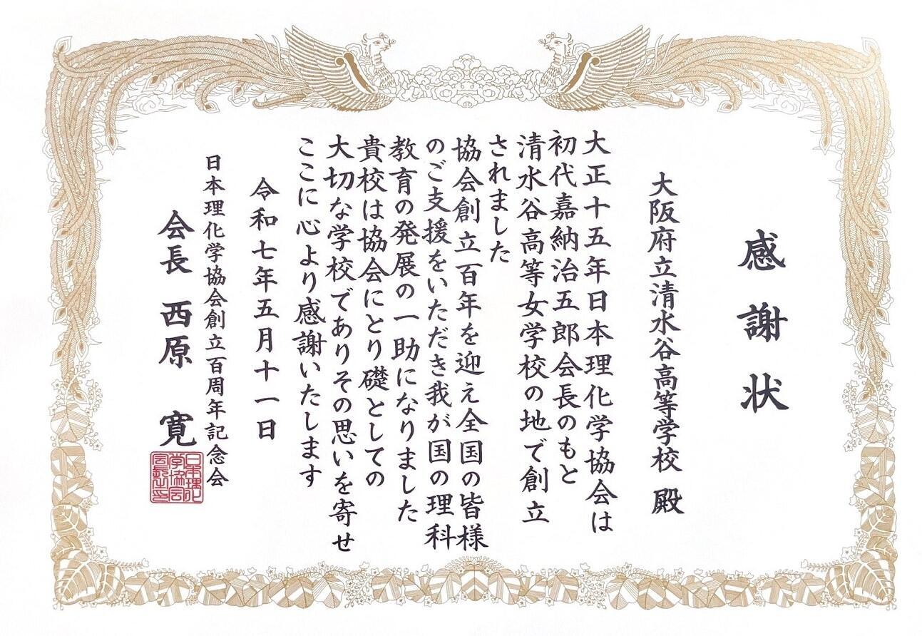 日本理化学協会は、今日まで100年にわたり日本の理科教育の発展と充実に大きく貢献されてきた由緒ある協会です。大正15年(1926年)5月に嘉納治五郎氏を初代会長として創立され、第1回設立総会・研究大会が清水谷高校の前身である清水谷高等女学校において開催されました。その後、同協会が大きな発展を遂げられる中で、記念誌の表紙に当時の清水谷高校の校舎を掲載されるなど本校を創立の地として常に大切にしていただいています。また、今年の5月に東京で行われた創立100周年記念会では感謝状を授与していただき、本校の歴史に新しい頁が加わりました。(感謝状は済美館と校長室に掲示しています。)