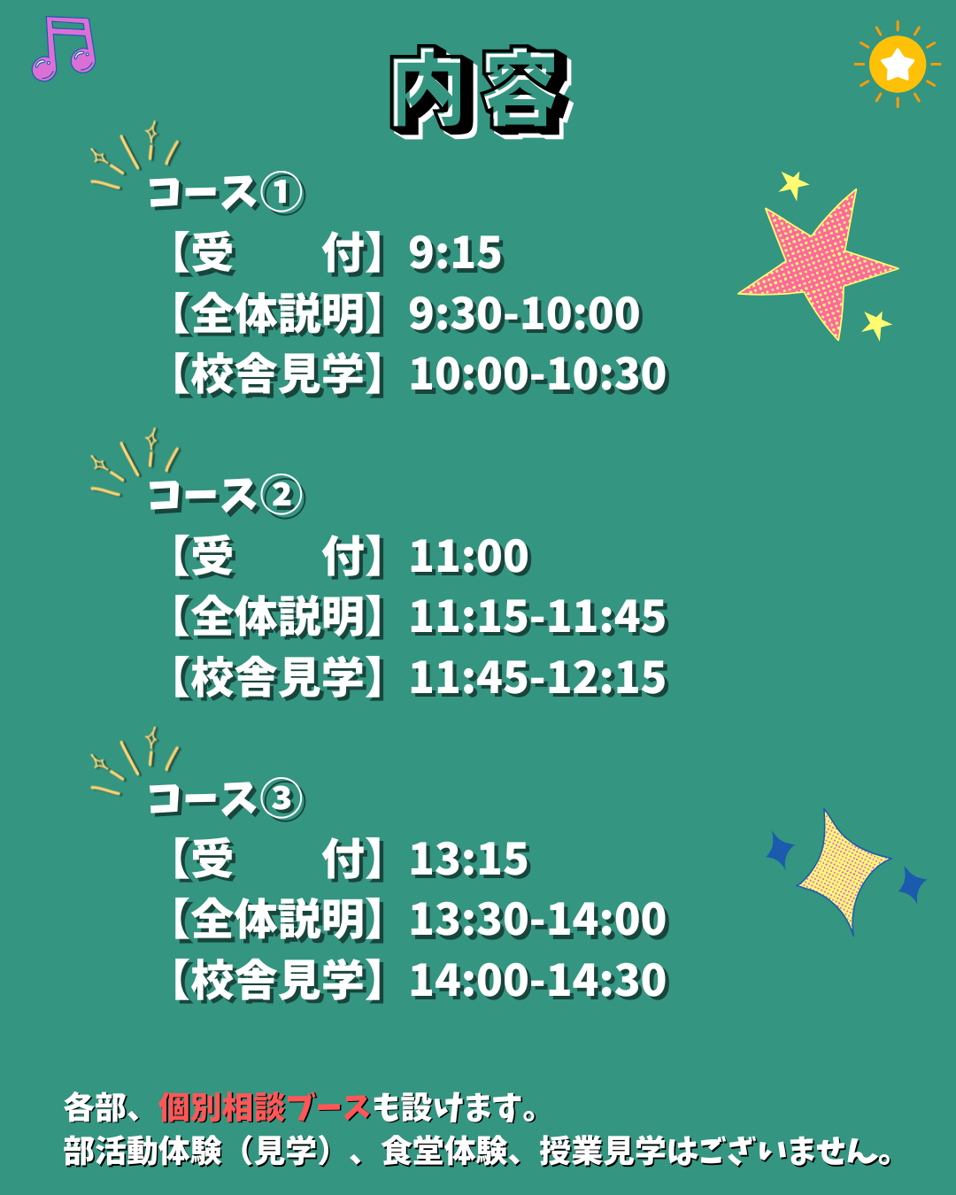 各コース、定員に達した場合は締め切らせていただきますのでご了承ください。